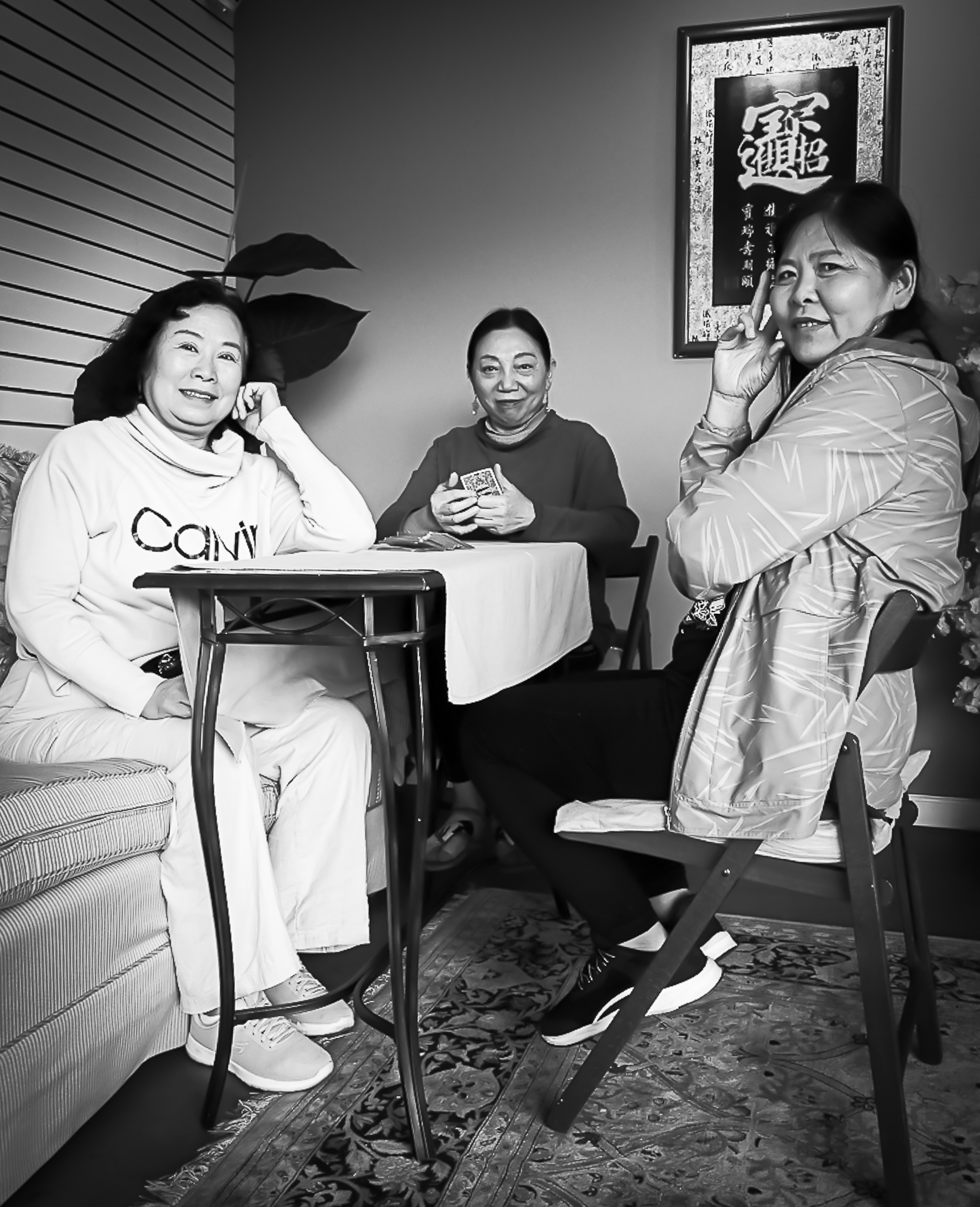 Three women sitting around a table with a cloth, inside a room with a framed artwork on the wall, one woman is wearing a hoodie with the word 'Canvi', another is holding a deck of cards, and the third is making a gesture near her temple.